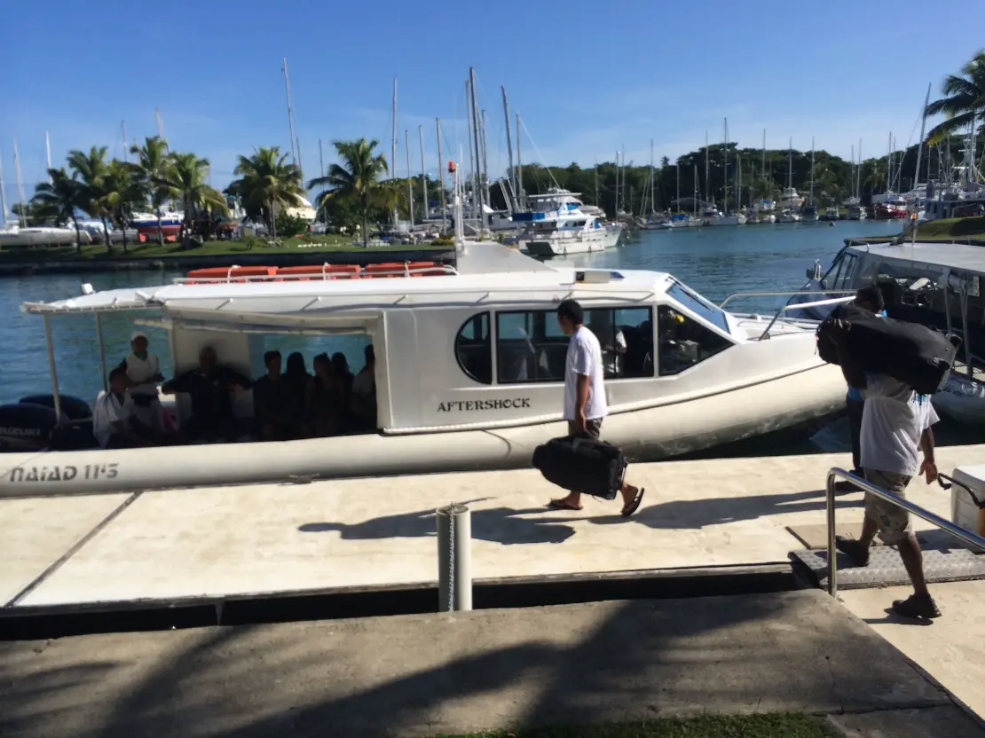 The resorts own transfer vessel Aftershock, makes a return trip daily to the island, the one way Adult Fare is $85 USD and for a child 5-12 years its $55 USD, children under 5 yrs are free. It is also be available for private charter to meet specific flight arrival or departures, with a minimum rate of $999 USD one way for up to 20 passengers. We also offer split charters with other resort departures or arrivals on the same day with similar flight times this allows for one way fares as low as $49 USD per person.